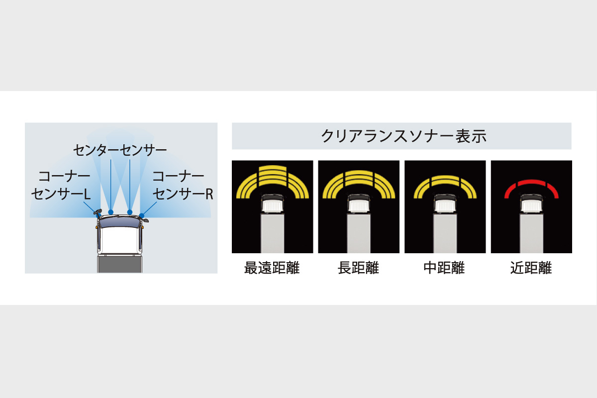 ■前進誤発進抑制機能・低速衝突被害軽減機能は衝突被害軽減ブレーキが働くシステムですが、必ず止まることを約束するものではありません。 ■道路状況、車両状態および天候状態等によっては作動しない場合があります。また、衝突の可能性がなくてもシステムが作動する場合もあります。詳しくは取扱説明書をご覧ください。 ■安全運転を行う責任は運転者にあります。常に周囲の状況を把握し、安全運転に努めてください。 ■ソナーの検知範囲、作動速度には限界があります。必ず車両周辺の安全を確認しながら運転してください。 ■運転者自身で前進誤発進抑制機能・低速衝突被害軽減機能の衝突被害軽減ブレーキ制御を試すことはおやめください。 ■写真のクリアランスソナーの検知範囲はイメージです。