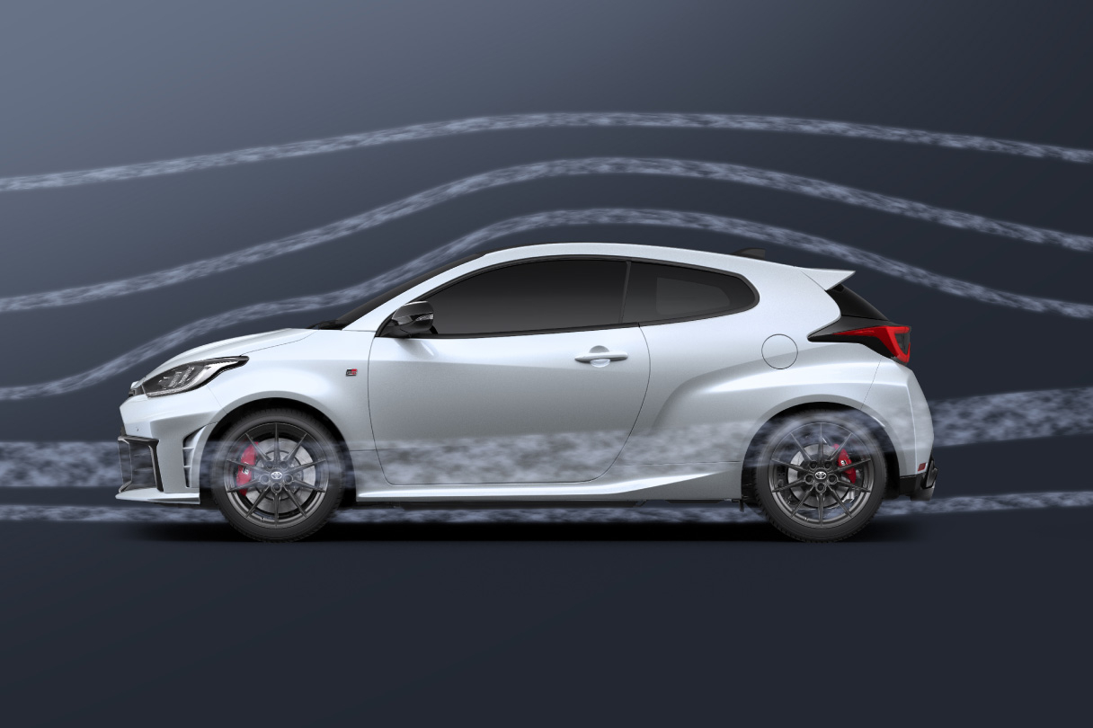 ラリーシーンでのダウンフォースの獲得を狙い、リヤスポイラーへと効果的に風が当たるよう、ルーフ後端を下げたアッパーボディを専用開発。さらに、フロントのロアスポイラーやカナード機能を持つコーナー部、ルーフとクォーターピラーまわりを絞り込んだリヤの造形により、ダウンフォースを増大。車速を増すほどにボディが路面に押し付けられ、コーナリングスピードが高められる特性を実現しています。また、WRCマシンと同様の手法でホイールハウスからボディに沿って空気を抜くことで、空力性能を向上。さらに、ボディ下面の広範囲をアンダーカバーで覆うことにより、空気抵抗をいっそう低減しています。こうしたエアロダイナミクスの開発は、TOYOTA GAZOO RacingのWRCチームの施設で繰り返し行われた風洞実験の結果と、彼らとの妥協のないコミュニケーションの積み重ねにより造り上げられています。
