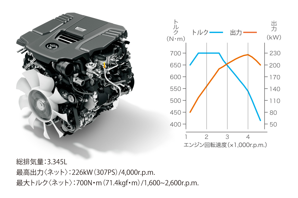 ピストン燃焼室、吸気ポート、インジェクターといったエンジン各部の構造を最適化し、高出力と優れた燃費性能を両立した3.3LV型6気筒ツインターボディーゼルエンジンです。走りの面では、新採用の可変ノズル付2ウェイツインターボが、あらゆるシーンで爽快な加速感をもたらす過給性能を実現。低速域ではシングルターボの高レスポンスによる力強い加速に、高速域ではツインターボの大吸気量によるのびやかな加速に寄与します。また、電子制御ファンカップリングを新たに採用し、優れた燃費性能と静粛性に貢献。新技術の尿素SCR*1-DPF*2システムは、排出ガスのクリーン化に高い効果を発揮します。