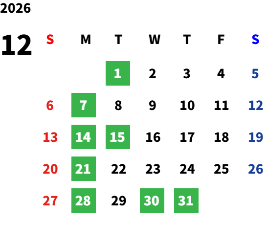 毎週月曜日と第1・第3火曜日になります 定休日については営業日カレンダーをご参照下さい。